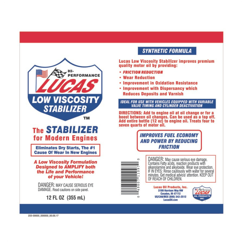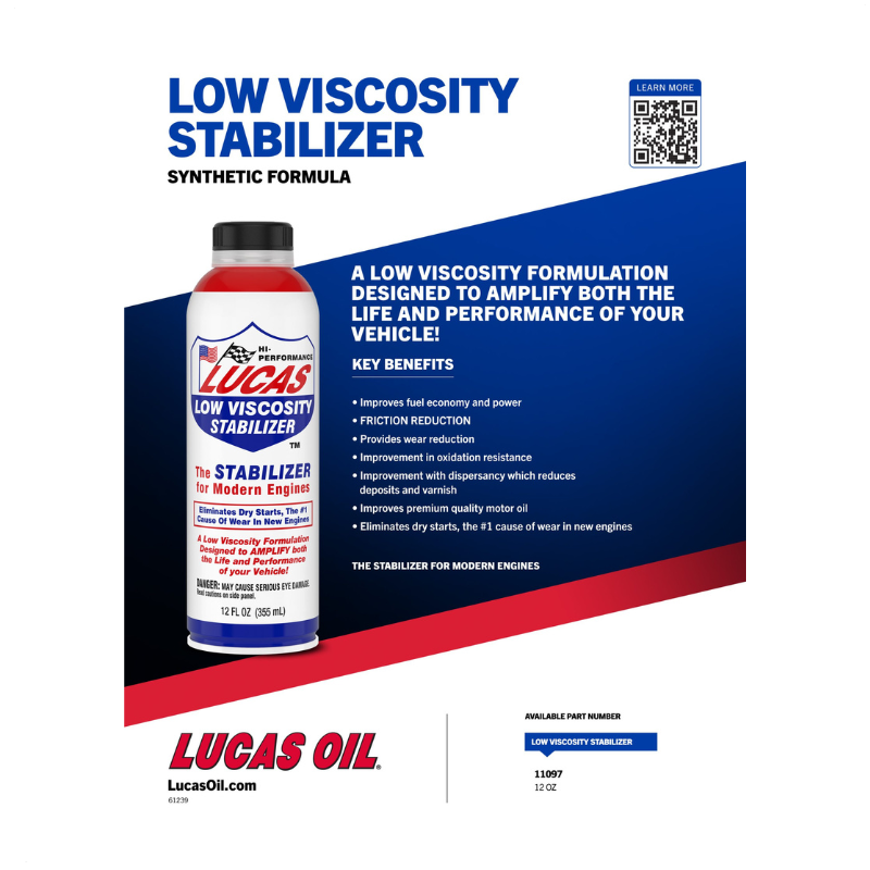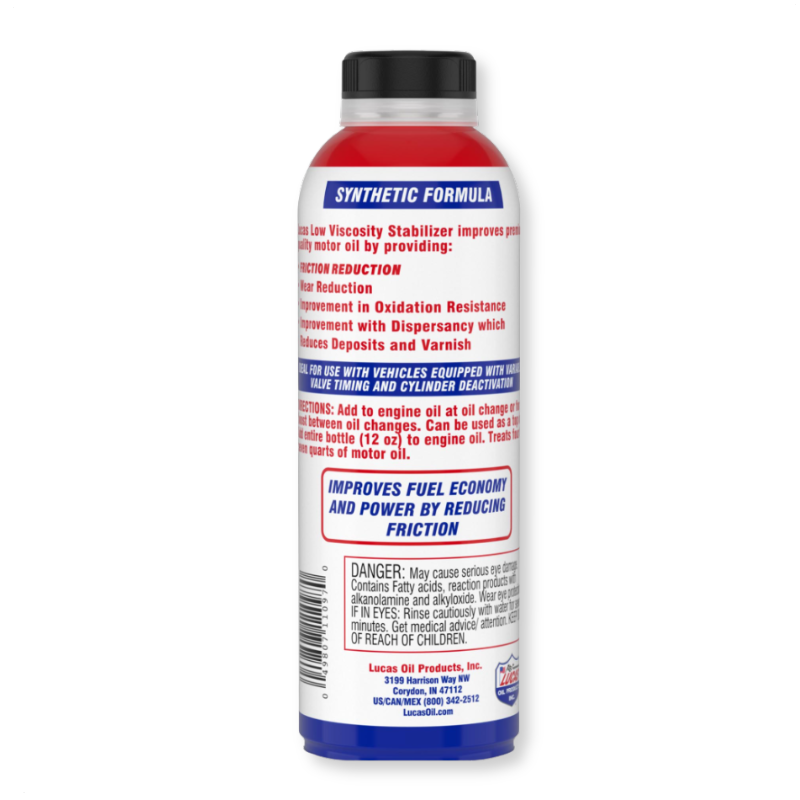 Lucas Low Viscosity Stabilizer is a premium synthetic engine oil treatment designed to enhance the performance and protection of modern, high-efficiency engines. Specially formulated for low-viscosity applications, it improves engine performance in four key areas: anti-wear protection, friction reduction, engine cleanliness, and oil longevity.