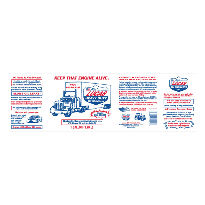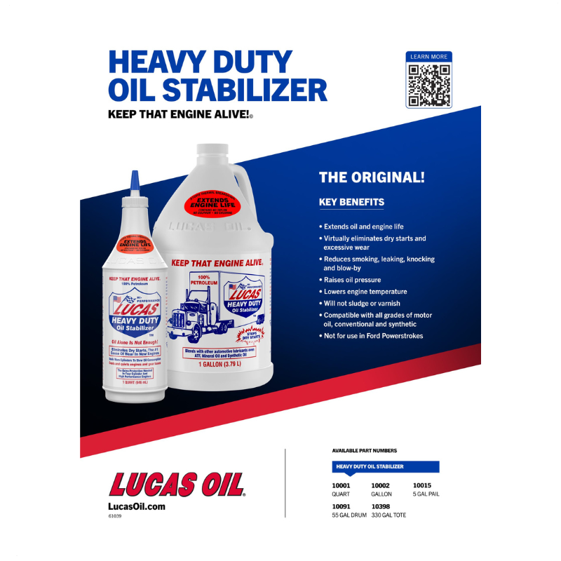 Lucas Heavy Duty Oil Stabilizer is a premium, multi-purpose petroleum-based oil additive designed to improve engine lubrication, reduce friction, and extend engine life. Its advanced formula strengthens the oil film between moving parts, helping engines run smoother, quieter, and cooler while reducing wear and operating temperatures.